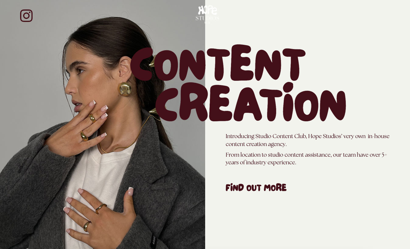 This split layout uses bold, characterful typography alongside strong editorial imagery to let the brand speak loudly and confidently. The contrast between image and type creates instant impact, while the relaxed spacing keeps the composition feeling calm and considered. It’s a playful, fashion-led moment that reinforces the studio’s creative confidence and visual identity.